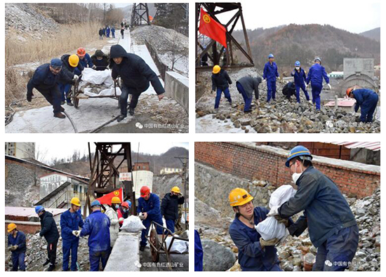 中色红透山团员青年回收矿斗运输过程中洒落的矿石