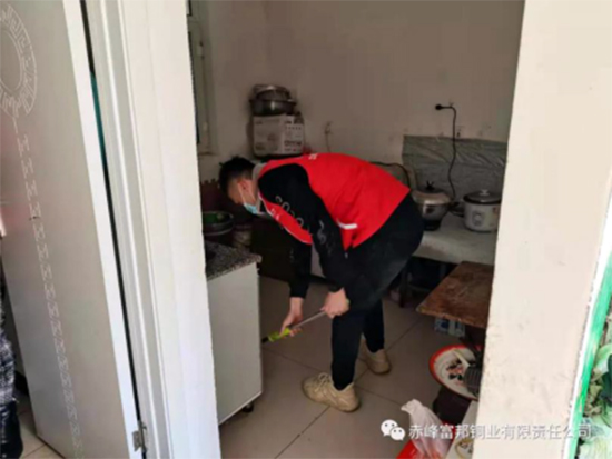 中色沈矿富邦铜业青年志愿者对孤寡老人的住所进行清扫