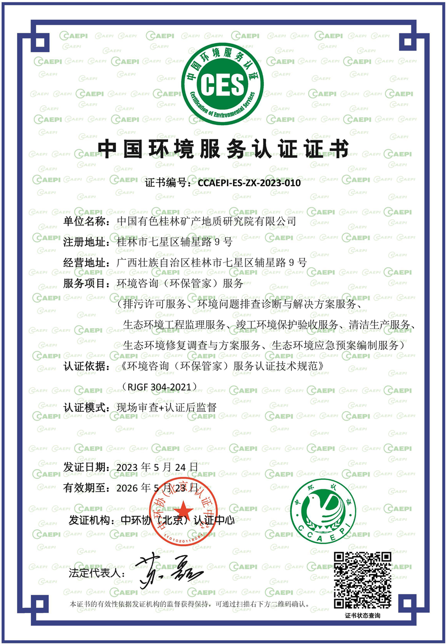 近日,公司顺利通过中国环境保护产业协会环境咨询(环保管家)服务认证,获得由中环协(北京)认证中心颁发的环境咨询(环保管家)服务认证证书,并获授权使用CES认证标识。